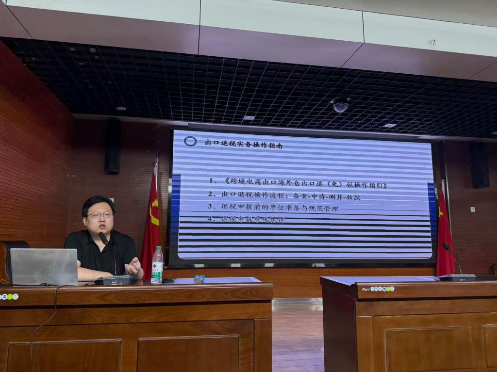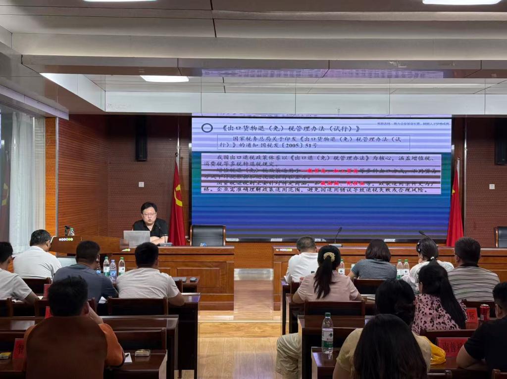 近日,经济管理学院关务与外贸服务专业教师柴立军受合作企业“贸易森林”团队邀请,赴徐州丰县开展了以“出口退税政策解析与实务”为主题的专项培训,当地外贸企业代表及从业人员近百人参加活动。