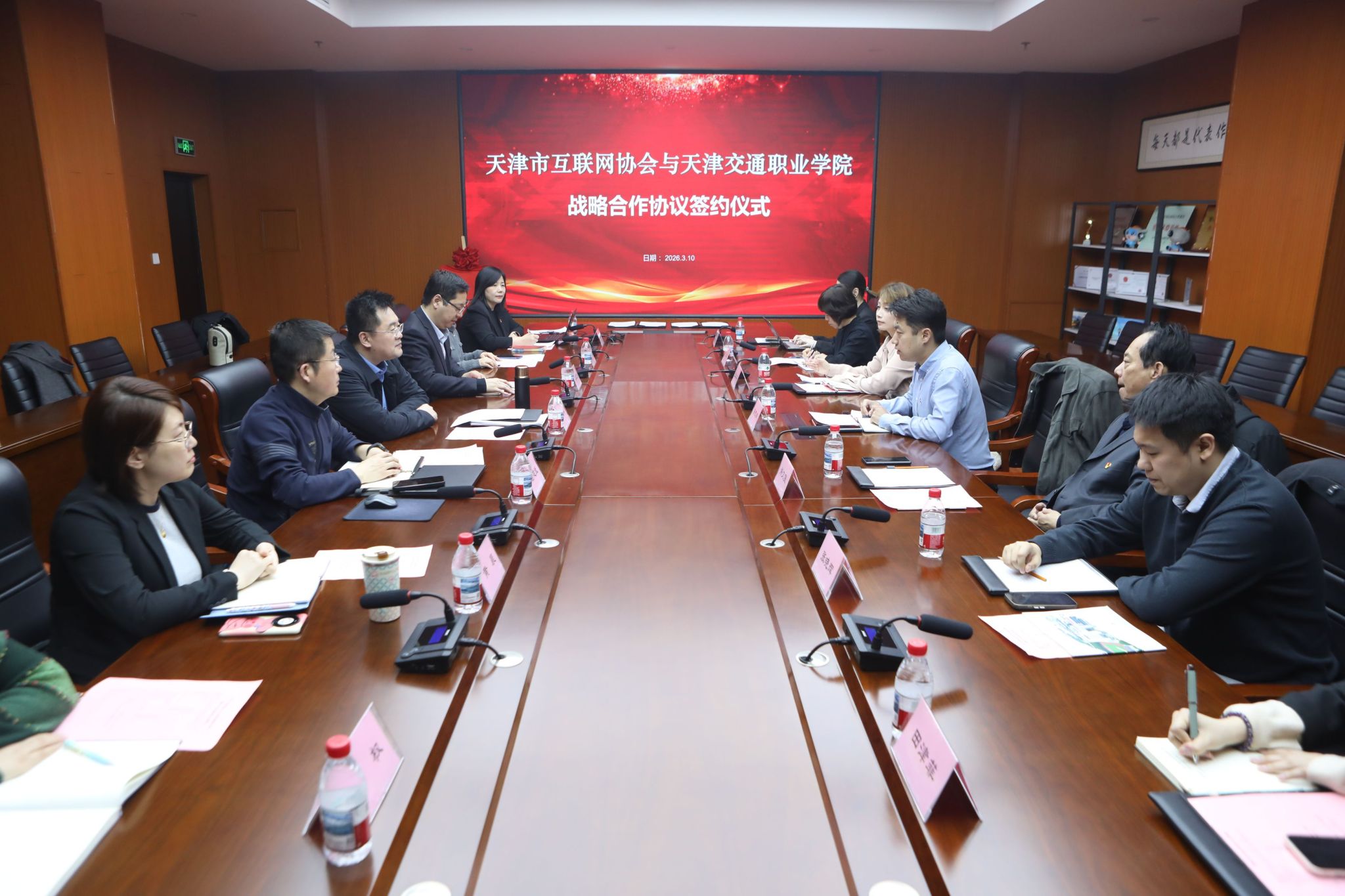 为深化产教融合、促进校企协同育人,2026年3月10日,天津市互联网协会与天津交通职业学院战略合作签约仪式暨党建共建揭牌仪式在学院新综合楼二楼西侧会议室举行。天津市互联网协会副会长兼秘书长孙凯桐及协会代表,学院院长于海祥、副院长闫福刚、经管学院部门负责人、支部书记及教师代表共同出席。